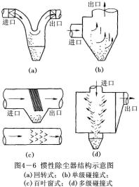 慣性除塵設(shè)備分為碰撞式和回轉(zhuǎn)式兩種。前者是沿氣流方向裝設(shè)一道或多道擋板,含塵氣體碰撞到擋板上使塵粒從氣體中分離出來。顯然,氣體在撞到擋板之前速度越高,碰撞后越低,則攜帶的粉塵越少,除塵效率越高。后者是使含塵氣體多次改變方向,在轉(zhuǎn)向過程中把粉塵分離出來。氣體轉(zhuǎn)向的曲率半徑越小。轉(zhuǎn)向速度越多,則除塵效率越高。